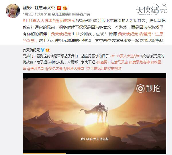 这封来自兄弟的信,不仅打开了尘封的回忆,还在结尾发出邀请,欢迎诸勇士前往“王者大陆”重启纪元!一时间浓厚的兄弟情引起众多勇士共鸣,其中“国服第一男刀”虎牙主播骚男在接到《天使纪》官方微博邀约后,第一时间转发应战,并直言这封信让他回想起寒冬陪他一起熬夜打通宵的兄弟!随后当红主播童话、芜湖神、大锤哥、菊花、九哥等纷纷转发并号召粉丝助战参与1月11日《天使纪元》公测当天的线下真人大逃杀活动!