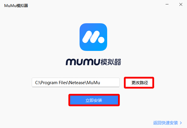 双击运行 MuMu模拟器安装包,先点击自定义安装按钮,之后点击更改路径,选择需要安装的磁盘路径,选择完成后,点击开始安装;