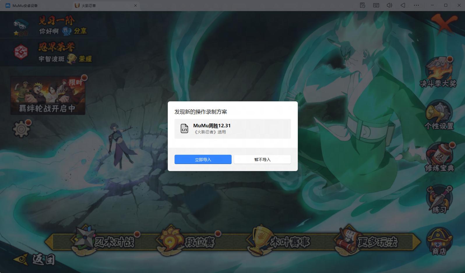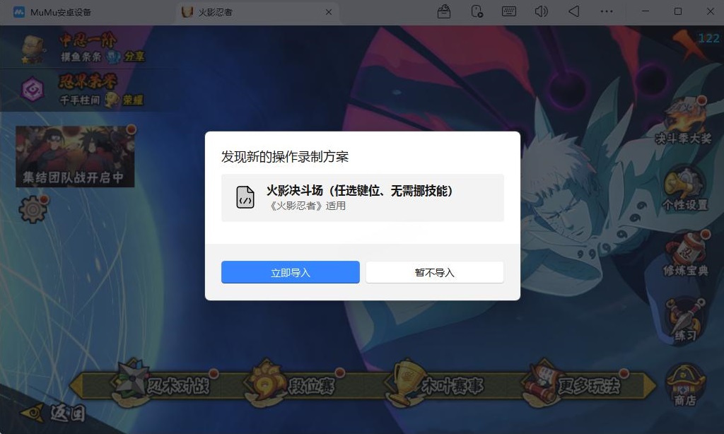 复制操作录制合集内对应玩法的操作录制分享码,打开 MuMu模拟器,在弹出的提示弹窗内点击“立即导入”。
