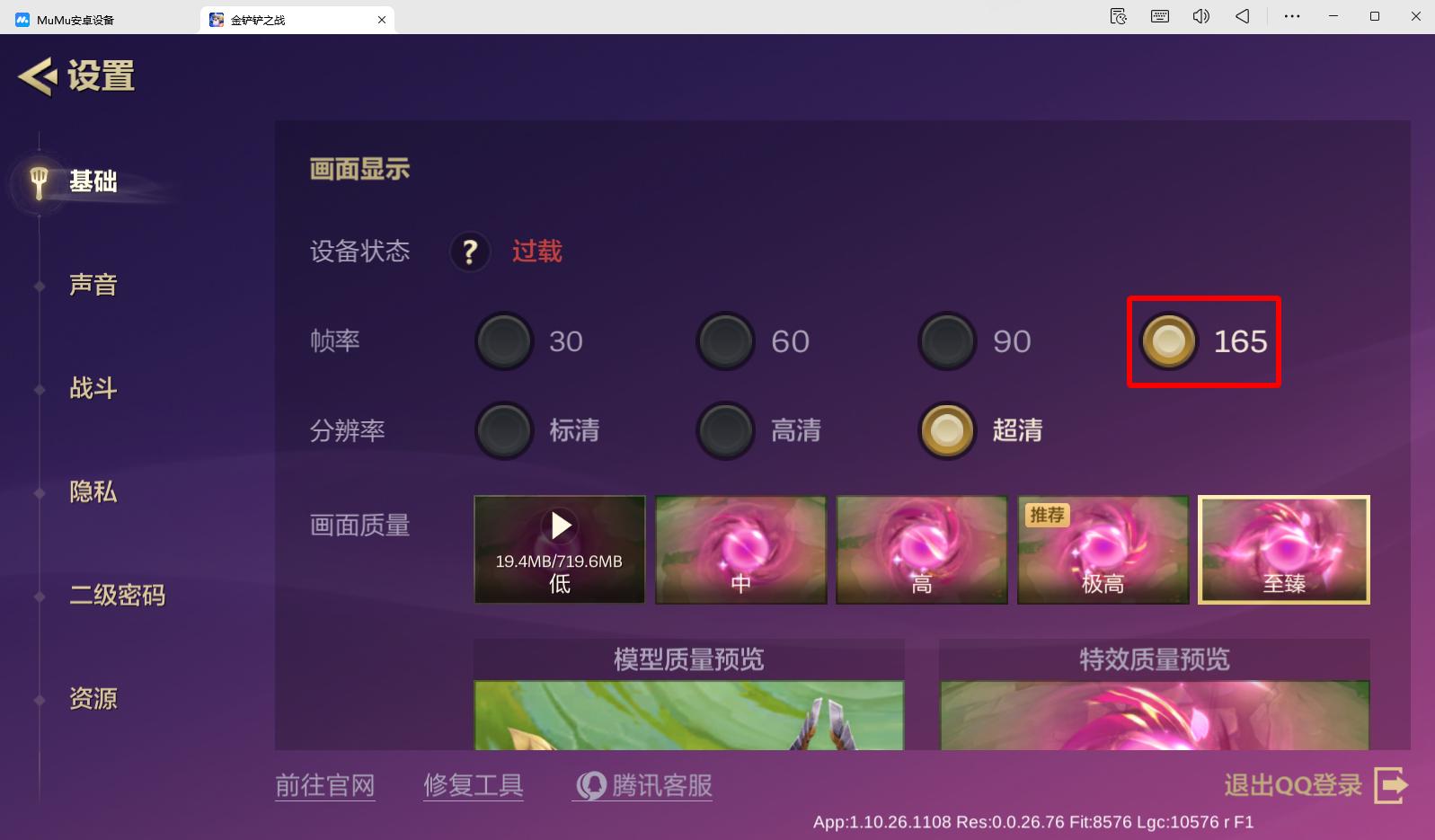 在 MuMu模拟器上运行《金铲铲之战》时,可能不清楚如何开启游戏高帧率,MuMu模拟器已经帮助玩家自动匹配了合适的机型,无需主动设置机型,就能在游戏中开启 165 帧最大帧率模式!
