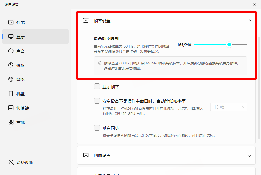 点击 MuMu模拟器右上角菜单-设置中心-显示,将帧率调整到 165,保存设置并重启模拟器;