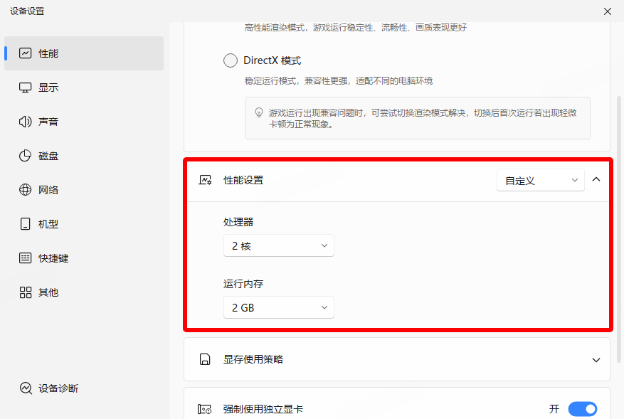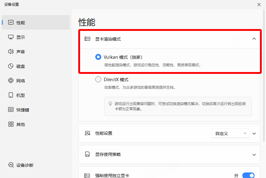 点击 MuMu安卓设备菜单-设备设置-性能,显卡渲染模式选择 Vulkan 模式,将性能设置调整到 3 核 4G 及以上设置,再将显存使用策略调整到自动调优,并勾选强制使用独立显卡功能。