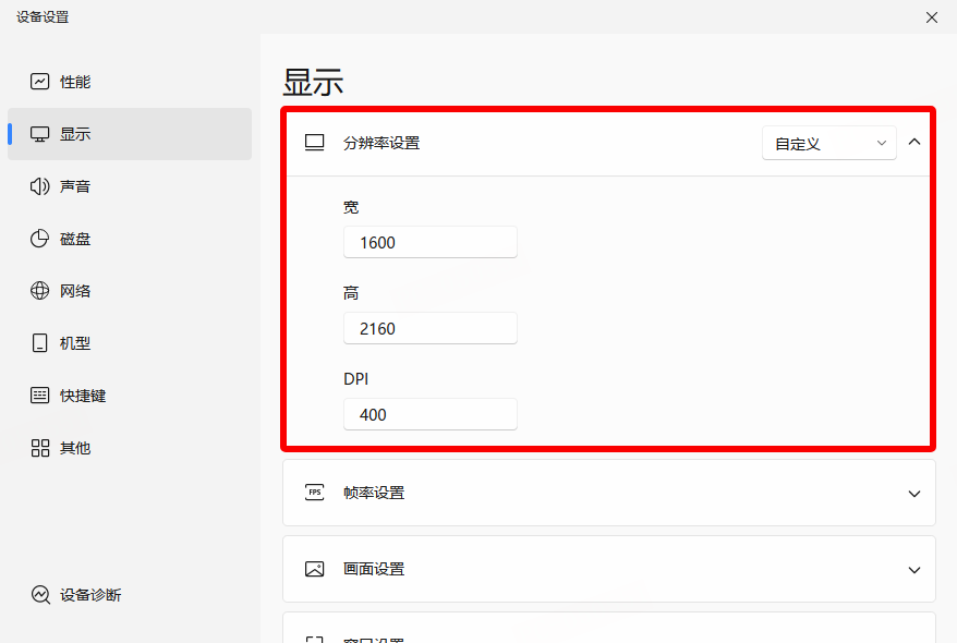 点击 MuMu安卓设备右上角菜单-设备设置-显示,将分辨率自定义设置为1600*2160,就可以实现iPad模式的UI操作布局。