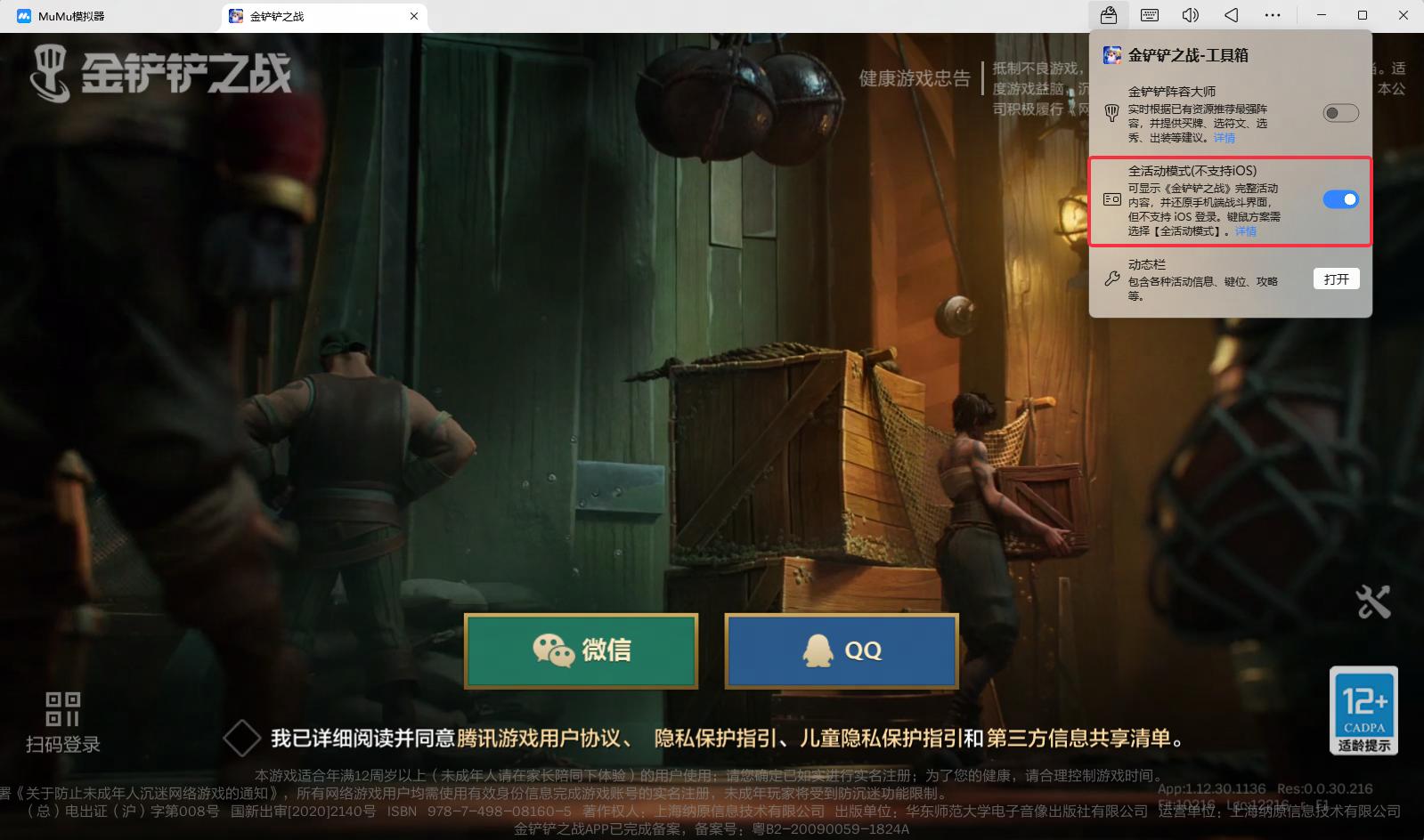 启动《金铲铲之战》,之后点击 MuMu安卓设备右上角工具箱图标,打开全活动模式(不支持 iOS)功能,之后重启游戏即可生效。