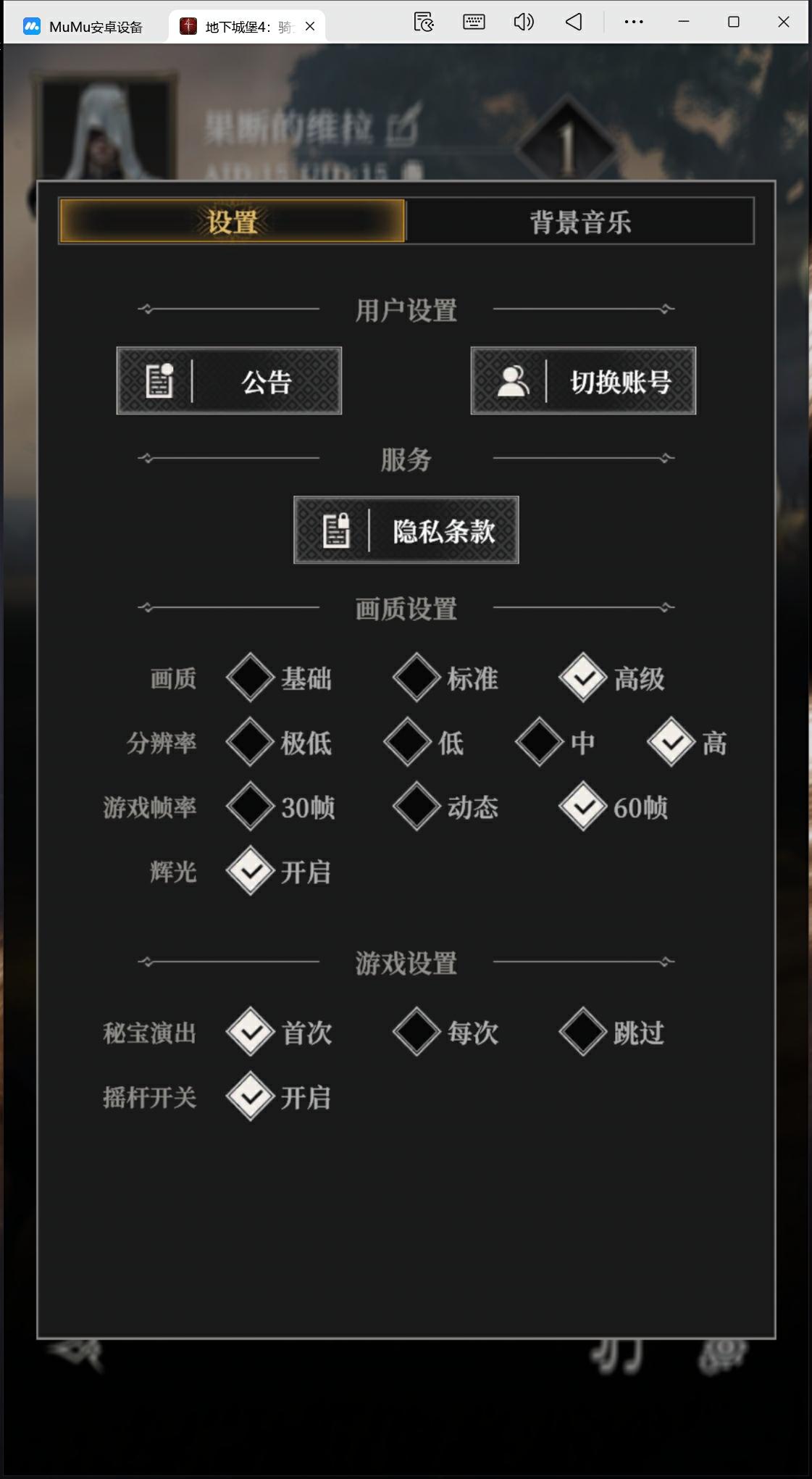 打开游戏设置界面,将画质调整到高级,分辨率调整到高,游戏帧率调整为 60 帧即可。