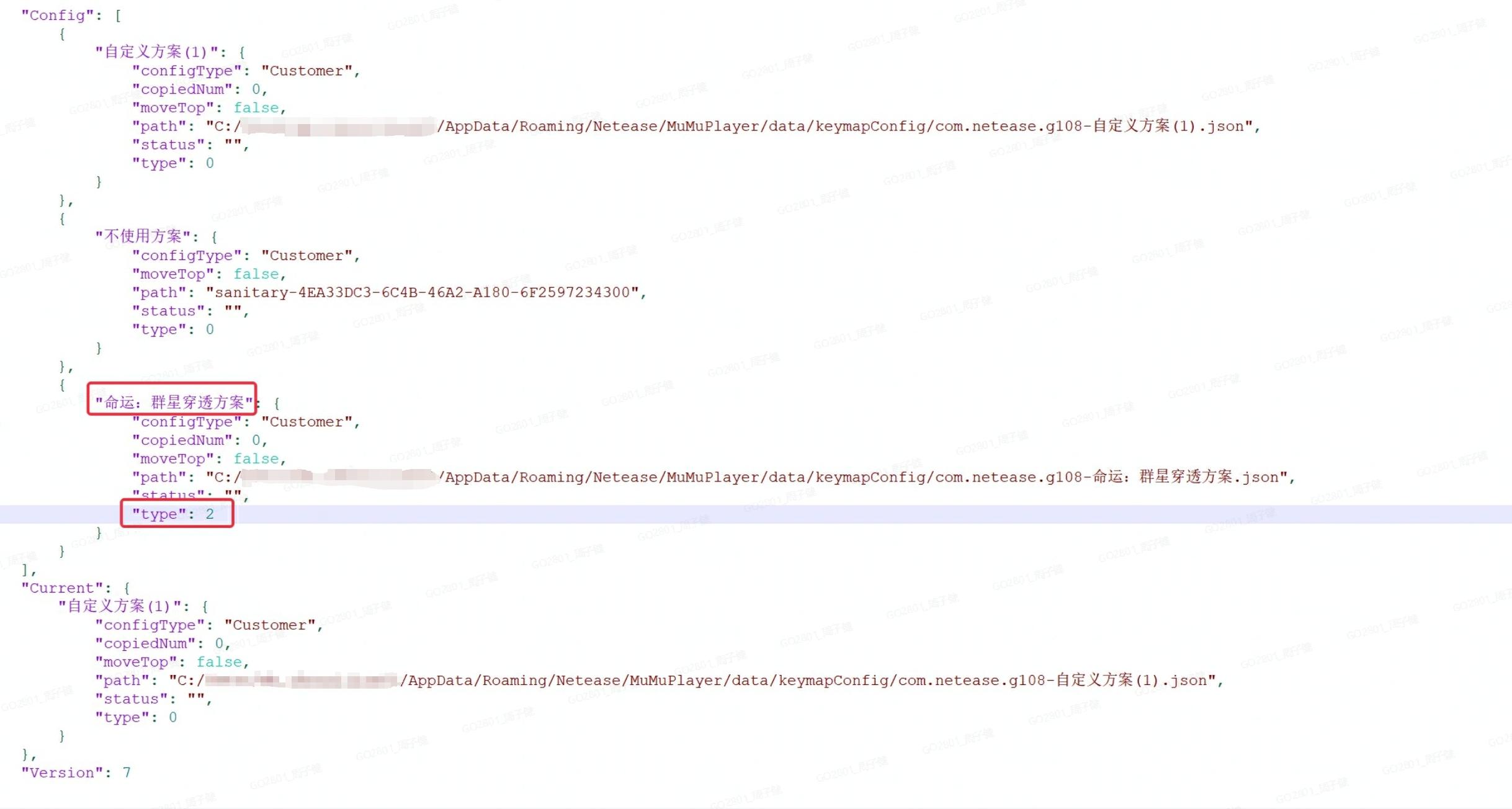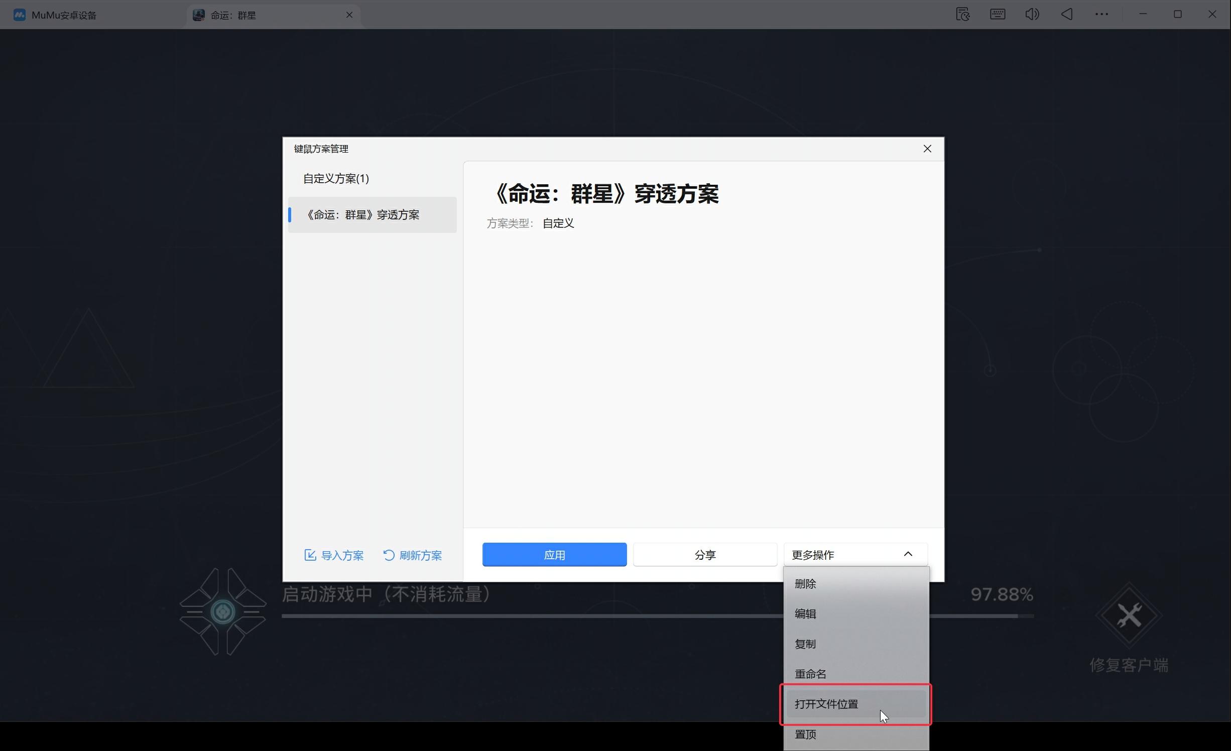导入完成后,选中已导入的方案,点击右下角更多,点击打开本地文件,在弹出的Windows窗口内找到【com.netease.g108.json】文件并打开,找到<命运:群星穿透方案>,将"type:0"修改成"type:2",保存后关闭。