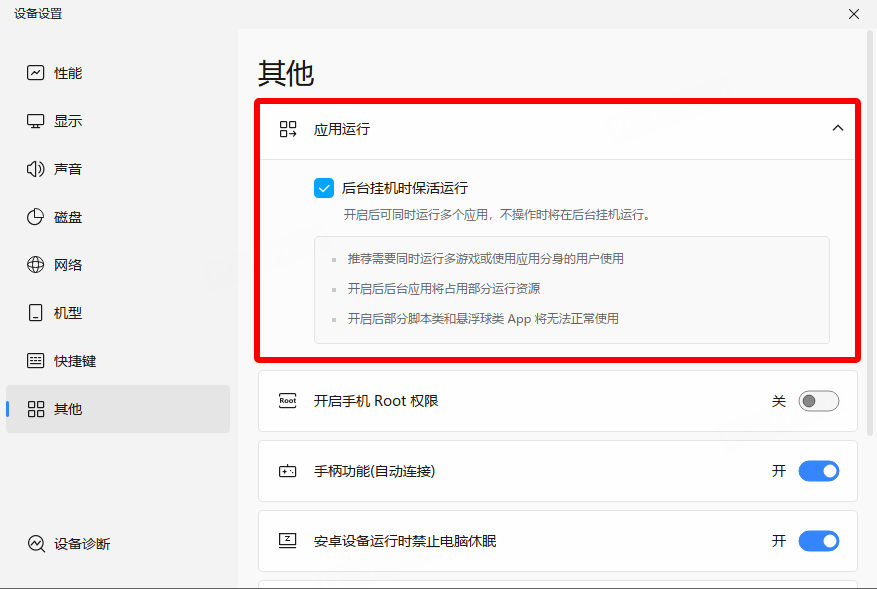 若需同时浏览运行《番茄免费小说》与游戏、应用,点击 MuMu安卓设备右上角菜单-设备设置-性能,适当调高模拟器性能设置,再点击其他-应用运行,勾选【后台挂机时保活运行】,保存设置重启对应 MuMu安卓设备后,拖动对应 APP 的标签页进行分屏即可。