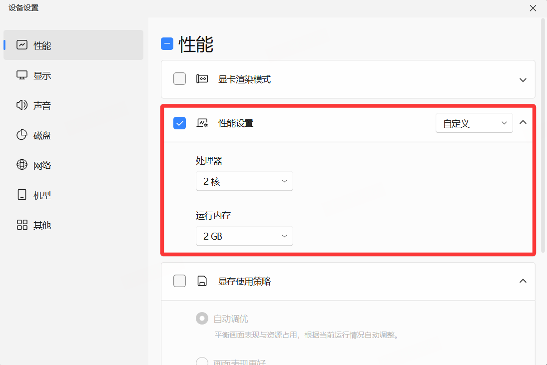 点击显存使用策略-选择【资源占用更小】,降低单个模拟器运行时的显存、内存使用;