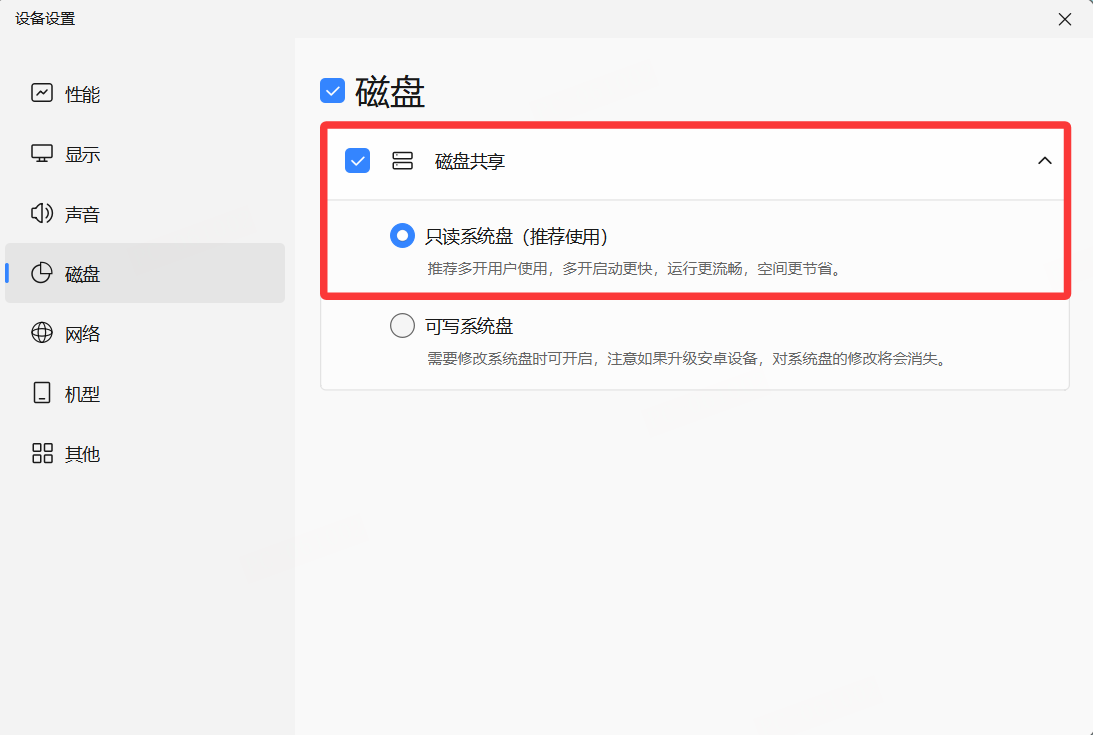 点击磁盘设置-磁盘共享-选择【只读系统盘】,多开启动更快、运行更流畅、节省占用空间。