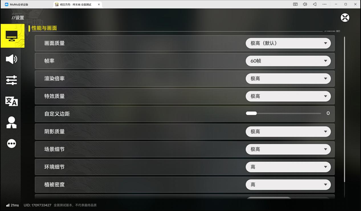 若当前使用机器配置较高,打开游戏设置-性能与画面,将游戏帧数调整为60,画面质量、渲染倍率、特效质量、阴影质量与场景细节均调整为极高,环境细节与植被密度调整为高。