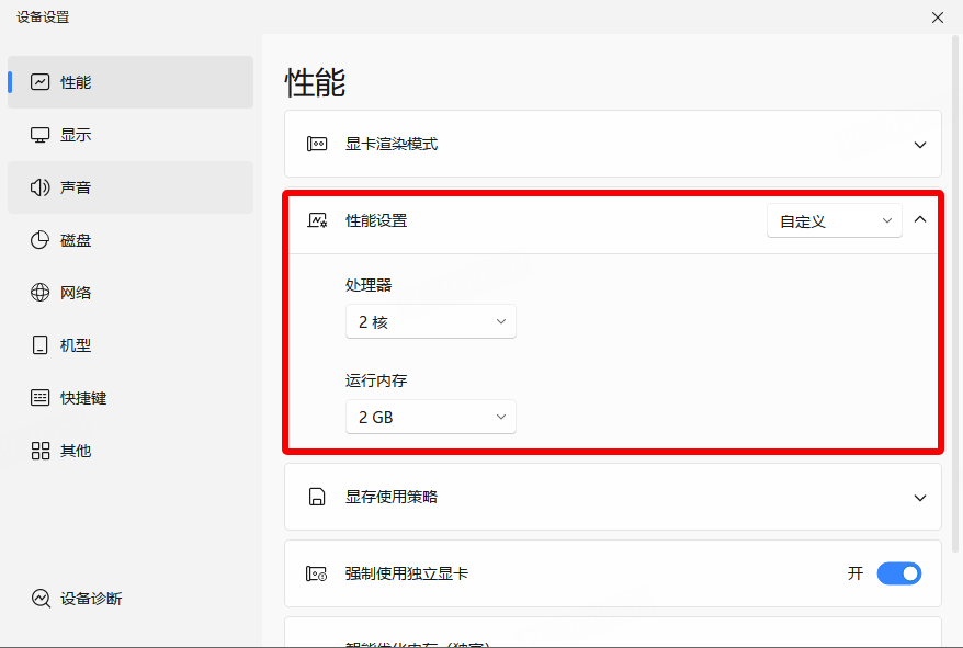 点击 MuMu安卓设备菜单-设备设置-性能,显卡渲染模式选择 Vulkan 模式,将性能设置调整到 3 核 4G 及以上设置,再将显存使用策略调整到自动调优,并勾选强制使用独立显卡功能。