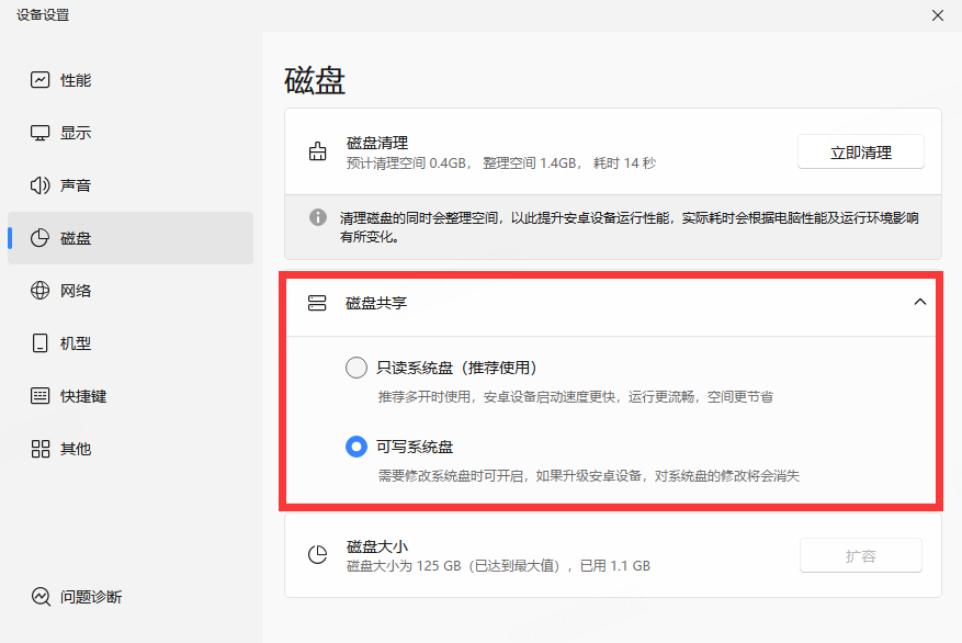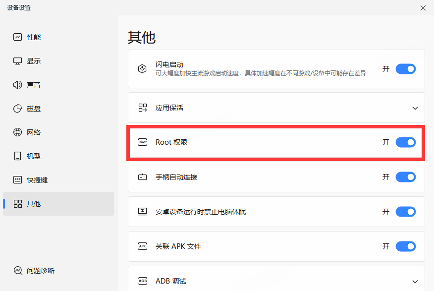 点击 MuMu安卓设备右上角菜单-设备设置-磁盘,将磁盘共享功能调整为可写系统盘,再点击其他,打开 Root 权限。