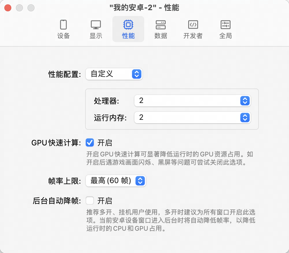 • 调高性能设置会减少电脑其他程序的可用资源,建议酌情根据设备实际使用情况调整性能,或避免同时运行高负载应用,或以防系统和模拟器卡顿。