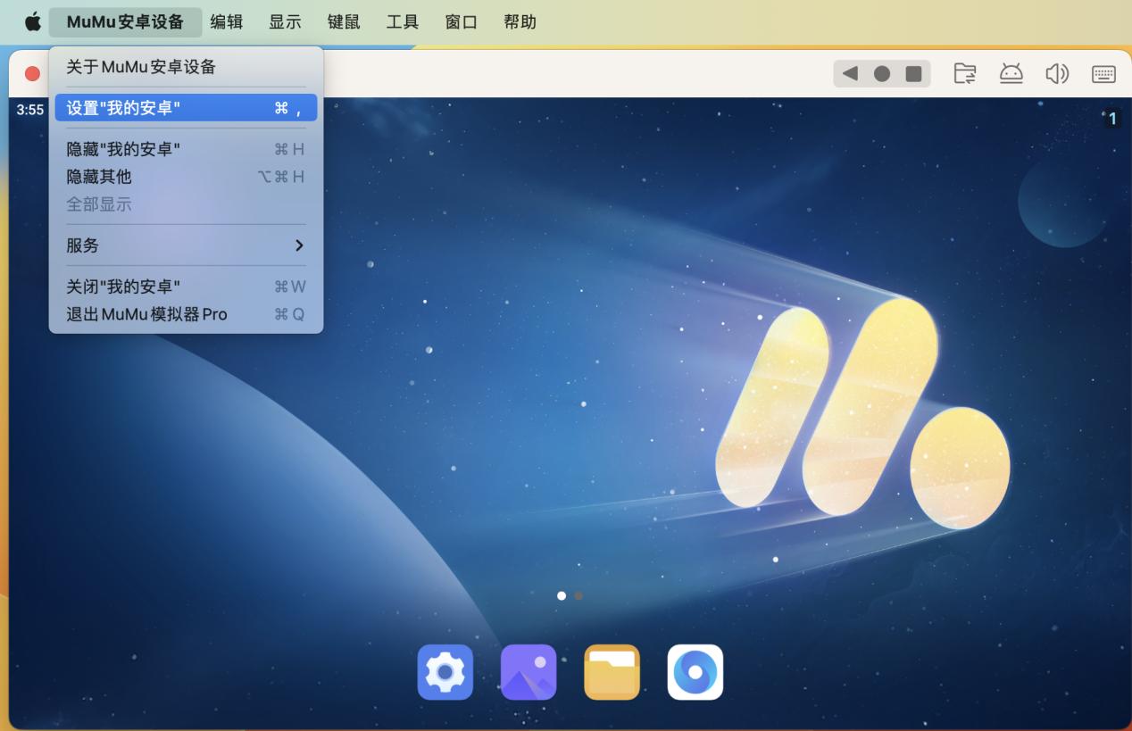 启动 MuMu模拟器(macOS),之后点击安卓设备,再点击顶部菜单栏【MuMu 安卓设备-设置“我的安卓”】,打开设置中心。
