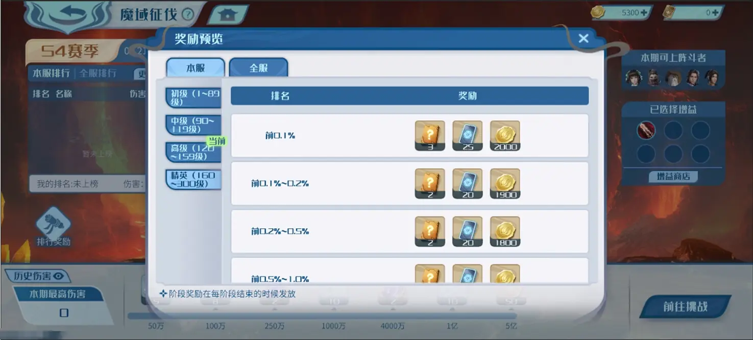 3.每次阶段开启时系统会根据玩家等级划分至对应难度区间,初级(1~89级),中级(90~119级),高级(120~159级),精英(160~300级),区间等级越高,每期伤害奖励以及排名奖励越丰富