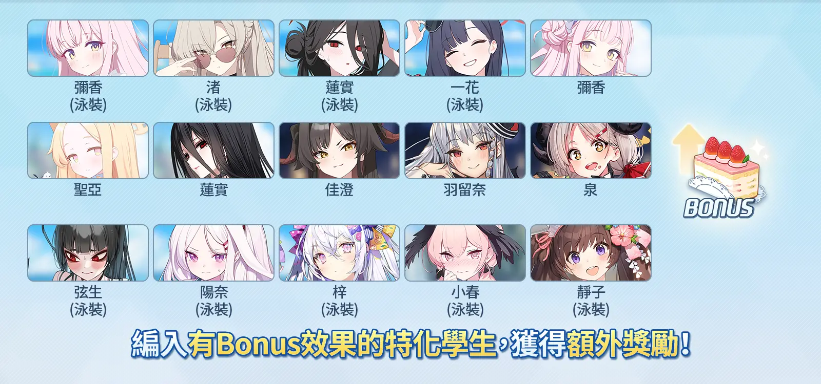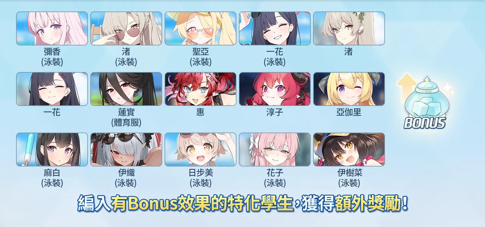 - 每種活動道具皆設有可獲得額外獎勵的「特化效果學生」。