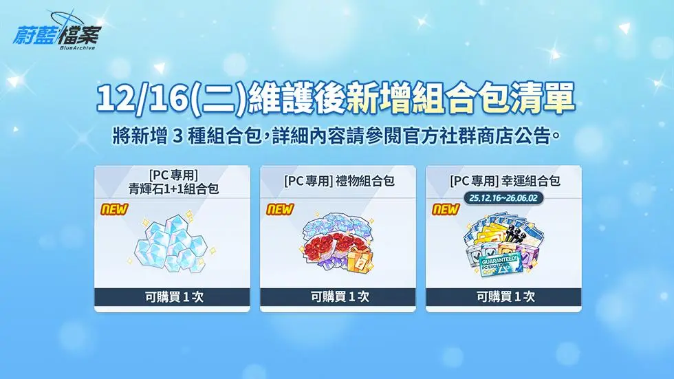 - 12月16日(二)維護後,青輝石組合包9種的購買次數將被重置。