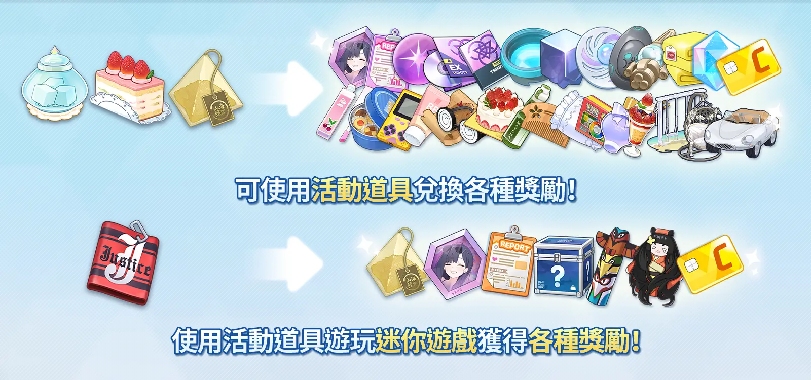 - 可使用透過完成「劇情(Story)」和「任務(Quest)」獲得的活動貨幣,來兌換(購買)活動商店的道具。